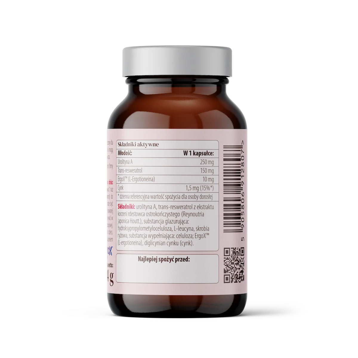 Składniki: urolityna A; trans-resweratrol z ekstraktu korzeni rdestowca ostrokończystego (Reynoutria japonica Houtt.); substancja glazurująca: hydroksypropylometyloceluloza (kapsułka); L-leucyna; skrobia ryżowa; substancja wypełniająca: celuloza; ErgoX™ (L-ergotionina); diglicynian cynku (cynk).